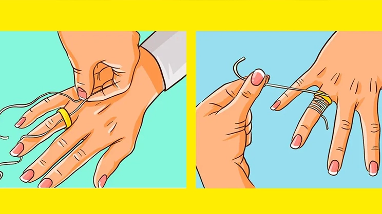 Так как снять кольцо с помощью нити? Протяните зубную нить под кольцом. Если она слишком тугая, сделайте это с помощью иголки или скрепки. Короткий конец нити придерживаем, а другой плотно наматываем на место отека. У вас должно получиться еще одно кольцо только уже из нити. Дальше этот конец удерживаем, а тем, что сверху начинаем раскручивать нить в том направлении, в котором наматывали. Вместе с ней начинает двигаться и украшение. Если кольцо остановилось посередине пальца и снова не двигается, повторите трюк с нитью еще раз. Также нить можно не протягивать через драгоценность. Намотайте ее на опухший сустав и смажьте растительным маслом, а затем начинайте поворачивать кольцо. Нить станет этаким островком спасения.