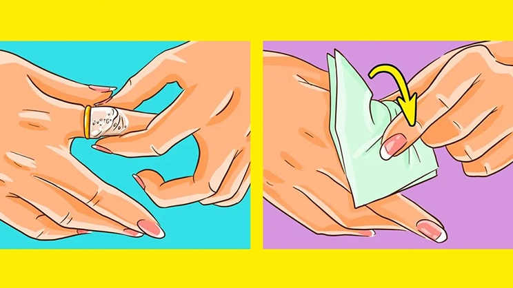 Первый прием снятия застрявшего на пальце кольца — классический и один из самых эффективных. Намыльте руку мылом, затем опустите ее в горячую воду. Покрутите украшение в разные стороны и осторожно потяните. Обычно достаточно пары попыток, чтобы кольцо начало двигаться и соскользнуло с пальца.