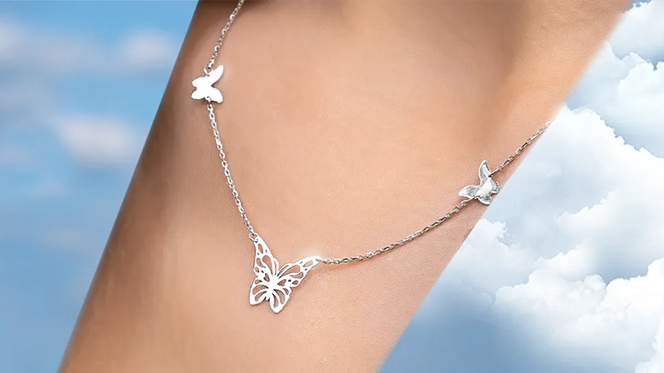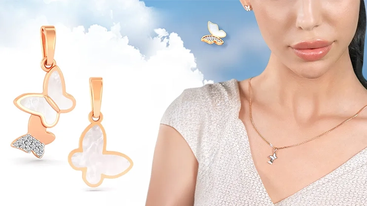 Бабочка – это символ преобразования и нового начала. Такие украшения будут напоминать о важности перемен и открытии новых возможностей в жизни. Дизайн может быть разным: от абстрактных и геометрических форм до более реалистичных. В ассортименте Столичной Ювелирной Фабрики представлены минималистичные золотые и серебряные колье, состоящие из тонкой цепочки и изысканных вставок в виде бабочек. Подвески могут изготавливаться только из благородных металлов или отделываться разными ювелирными материалами: прозрачными камнями, перламутром, цветной эмалью.