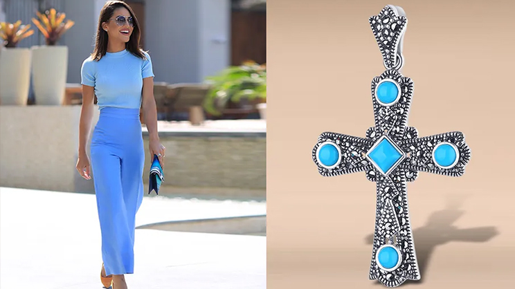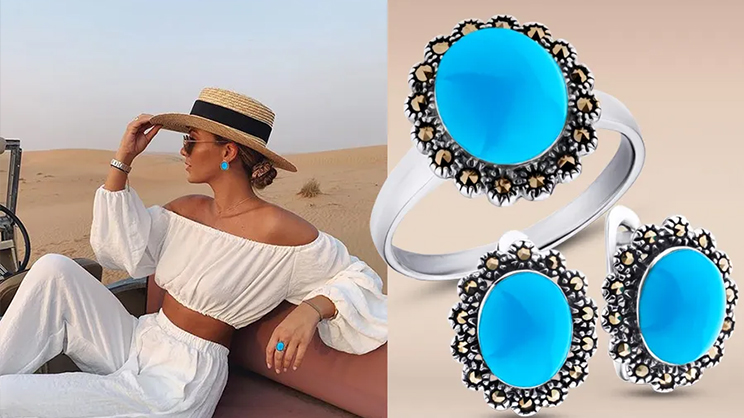 - «Небесный камень» - так называли раньше бирюзу за ее удивительный цвет. Ученые объясняют этот небесный цвет тем, что для рождения камня необходимы миллионы лет, в течение которых, вода просачивается сквозь горные породы, богатые медью, ионы которой и определяют ее удивительный цвет. У бирюзы есть множество оттенков и каждый из них удивляет своей естественностью - кажется, что в каждом из них небом, океаном, морем и облаками дышит сама природа. Блондинки, дополнив свой образ украшением с этим камнем подчеркнут чистоту и нежность образа, а брюнетки и шатенки удачно сыграют «на контрасте», сделав свой неповторимый стиль ярким и выразительным.