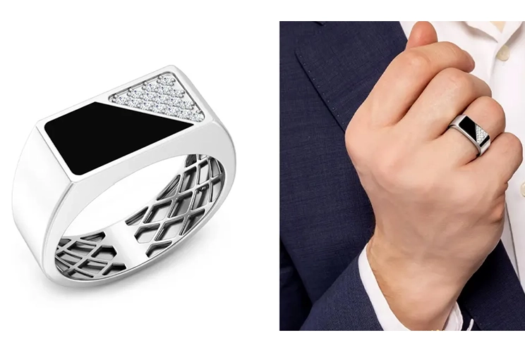 - Популярные кольца. Черная вставка в кольце — это эффектный акцент. Сегодня особенно актуальны лаконичные модели в желтом или розовом золоте, а также винтажные дизайны с геометрическими формами. Такие кольца хорошо сочетаются с однотонными аутфитами и неброскими аксессуарами.