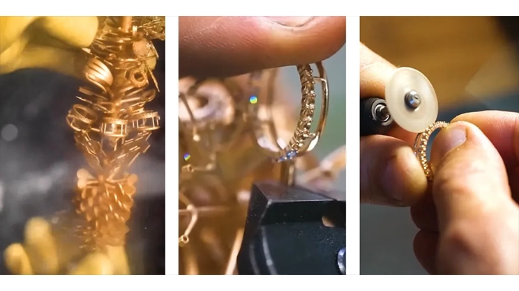 После охлаждения получается золотая «елочка» с готовой шинкой кольца и элементами декора. Форму разбирают, а все детали снимают со стержня кусачками. После шлифования и приведения в порядок всех «запчастей» будущего изделия основа передается для последующего соединения.