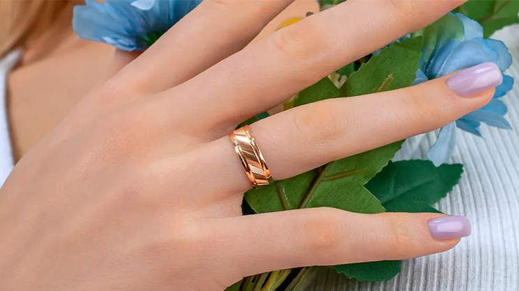 В этом году украшения из комбинированного золота продолжают быть в тренде. Оригинальное сочетание напоминает лед и пламя, белоснежный лунный свет и горячие солнечные лучи. Это олицетворение мужского и женского начал, их гармоничного союза. В зависимости от дизайнерской, задумки полоса контрастного цвета может располагаться посредине украшения, сверху или снизу. Особенно очаровательны модели с сияющим бриллиантом, а также – с отделкой внутренней поверхности кольца золотом другого цвета.