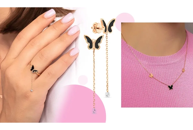 - Необычные формы — асимметрия, геометрические фигуры, природные мотивы (например, актуальна ювелирная коллекция «Бабочки», украшения в форме листиков и цветов).