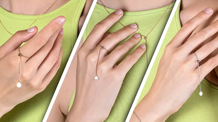 Если хотите создать очаровательный стиль для особого события, выбирайте кольца-цепочки с жемчугом и драгоценными камнями, наполняющими образ гламурным шиком.