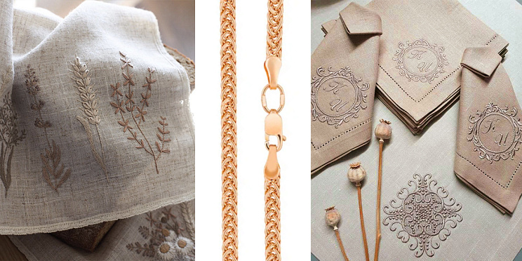 Выбирая, что можно подарить на годовщину свадьбы, стоит опираться на варианты, способные выдержать испытание временем, как и крепкий союз двух сердец. Золото и серебро соединяют прошлое, настоящее и будущее, а детали можно обыграть так, чтобы они тонко перекликались с «льняной» темой: светлый металл, фактурные поверхности, мотивы плетения, оттенки, напоминающие о поле, где распускается лен.