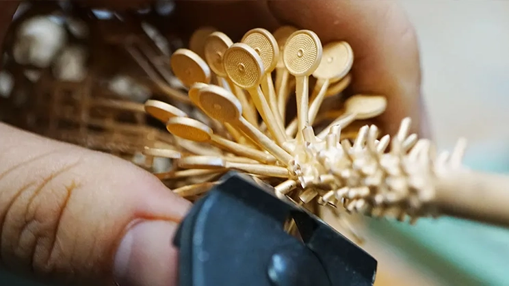 Далее технолог ювелирного производства удаляет изделие из замерзшей формы и вручную устанавливает восковую модель на инструмент - «Рождественскую елку». Это гипсовый инструмент-матрица, который может содержать до нескольких десятков изделий. Затем ее помещают в металлический рукав и заливают туда формовочную массу из гипса.