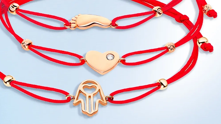 Красная нить на запястье — к счастью, удаче и благословению. Согласно распространенному поверью, браслет красного цвета на руку женщине должен надевать любимый мужчина. Так он разделяет со своей избранницей счастье, любовь и успех. Браслет ни в коем случае нельзя разрывать или разрезать. После того, как нить ослабнет, вы сможете заменить ее новой и повторить обряд. В каталоге Столичной Ювелирной Фабрики вы найдете очаровательные браслеты на красной нити с золотыми и серебряными вставками, которые обязательно понравятся вашей жене.