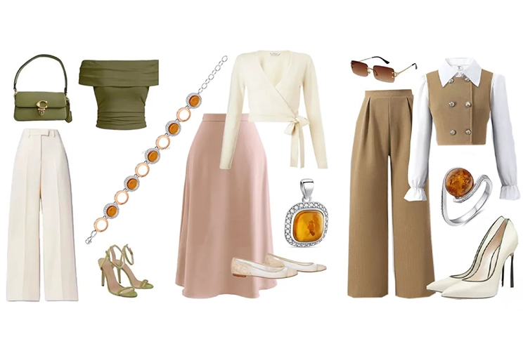 Янтарные драгоценности прекрасно сочетаются с одеждой в землистых и пастельных тонах: