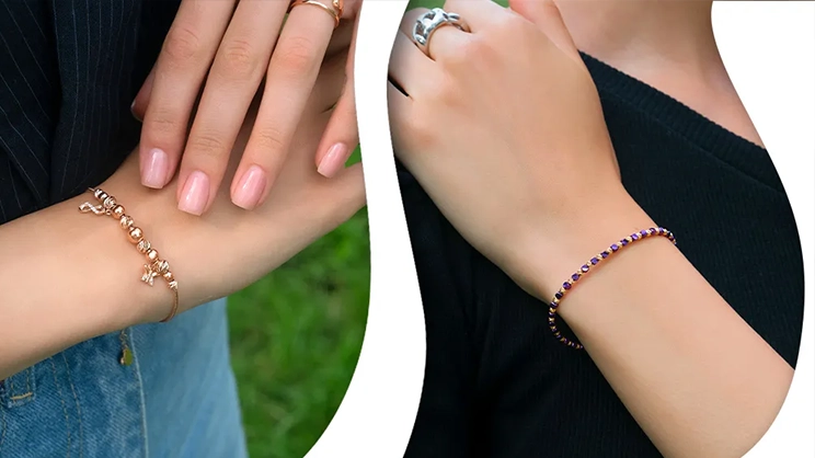 К категории классических браслетов можно отнести цепочные модели и жесткие украшения-скобы с лаконичным оформлением. Среди нестандартных решений следует выделить универсальные каучуковые браслеты, удобные для повседневного ношения и дополненные золотыми или серебряными декоративными элементами. Отдельную категорию составляют наборные браслеты с шармами, способные лучше всего продемонстрировать характер и интересы. Также практичным и красивым решением являются браслеты на шелковой нити с фигурной вставкой из золота или серебра. Интересный летний вариант – стильные анклеты, которые носят на лодыжке. Выгляди как звезда, не тратя космические средства!