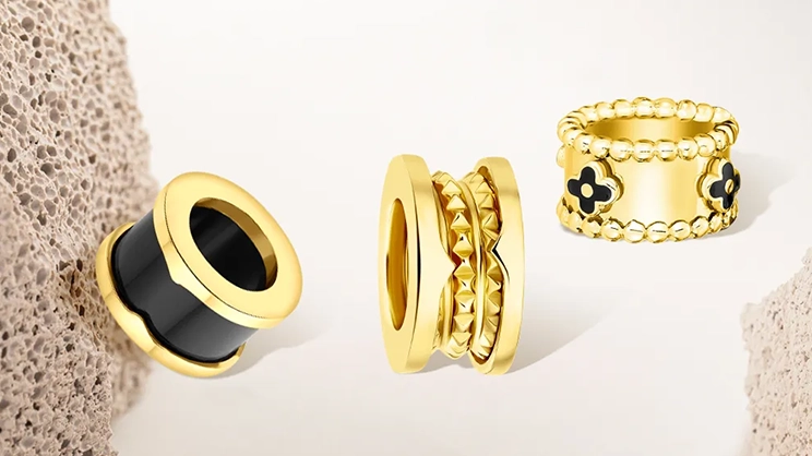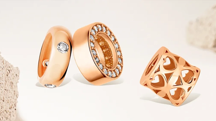- лаконичное ювелирное изделие с гладкой поверхностью и тиснением в виде гаек;