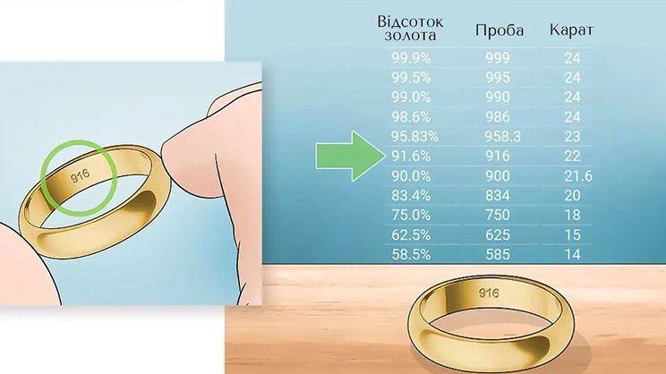 Потрібно вдарити по каблучці металевим предметом і послухати, як вона звучить. Золото видає високий дзвінкий звук, який звучить тривалий час. Цинк та мідь створюють більш глухий та короткий звук.
