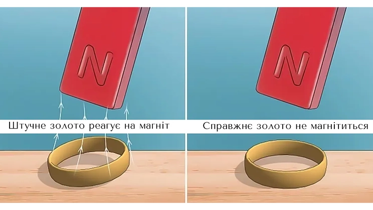 Аурум не притягується магнітом, а навпаки відштовхується. Тож найпростіший спосіб перевірити золото на справжність в домашніх умовах чи в магазині, прикласти до нього магніт. Вам знадобиться дійсно сильний магніт, який попередньо потрібно перевірити на інших металах. Якщо предмет притягується та утримується магнітом, це точно не чисте золото.