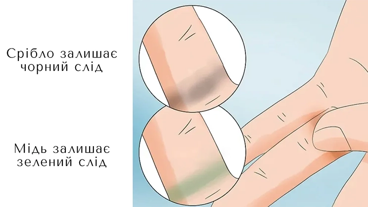 Обережно потріть золоту каблучку об шкіру на руці та спостерігайте за реакцією. Підроблені прикраси залишать на шкірі чорний, синій чи зелений слід. Однак цей спосіб максимально точно діє з найвищими пробами золота.