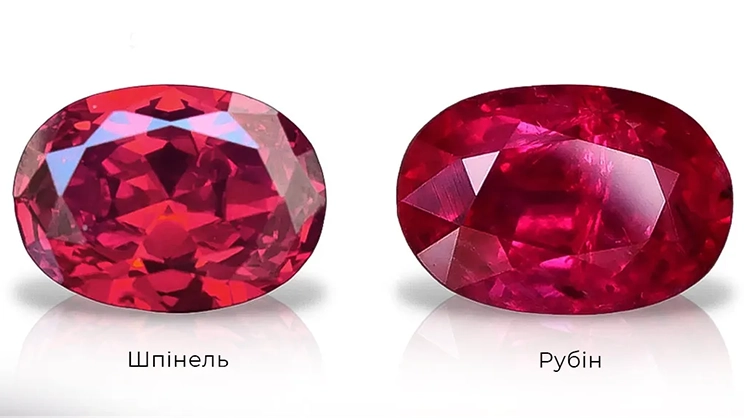 Ці два камені часто плутають через схожі червоні відтінки. Рубін, один із найцінніших червоних дорогоцінних каменів, складається з корунду і вирізняється високою твердістю (9 за шкалою Мооса), яскравим червоним кольором і вважається вельми рідкісним. Шпінель — це напівдорогоцінне каміння, буває червоного кольору, а також є рожеві камені. Цей мінерал м'якший і має інший хімічний склад.