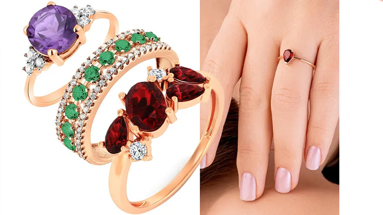 - Каблучки з кольоровими каменями — рубінами, сапфірами, гранатами, смарагдами тощо — додадуть яскравості стилю, тому будуть добре сприйняті прихильницями виразних образів. А якщо це ще й улюблений камінь або підібраний за датою народження, то подарунок матиме особистий характер.