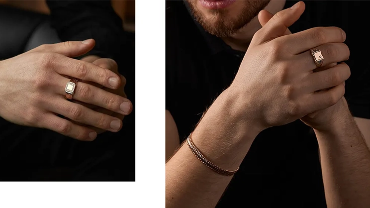 Столична Ювелірна Фабрика виготовляє ексклюзивні чоловічі прикраси з золота 585-ї проби усіх кольорів та срібла 925-ї проби. Це як мінімалістичні тонкі каблучки, так і вишукані персні та печатки з оздобленням та без. Усі коштовні камені проходять тестування у пробірній палаті та мають сертифікацію, яка підтверджує їх якість.