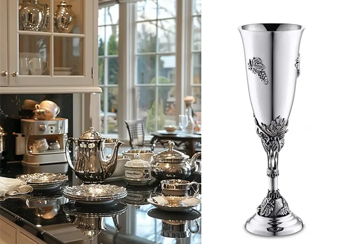 Одна з найважливіших переваг благородного металу — його здатність зберігати чистоту і благородний блиск упродовж століть. Він має природні антибактеріальні властивості, тому контакт з їжею безпечний для здоров'я. Крім того, матеріал вирізняється довговічністю: вироби не втрачають форми та блиску навіть за активного використання.