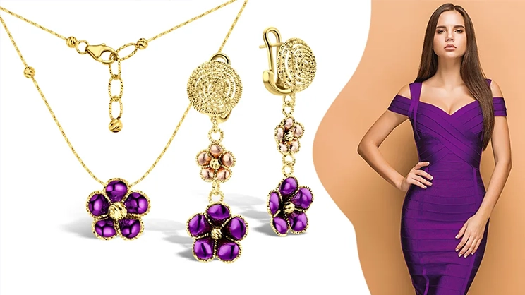 - Кольорова гама. Якщо вечірка відбудеться у світлому приміщенні, то ефектний вигляд матимуть прикраси з діамантами або прозорими штучними каменями, які гарно відбивають світло. На вулиці чи в темному приміщенні більш доречними будуть коштовності з теплими та темними насиченими кольорами, які створюватимуть додатковий контраст.